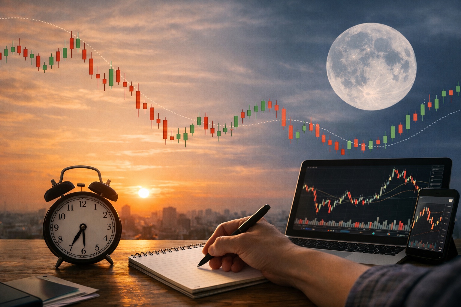 新月・満月アノマリーを使って最も得られるメリットは、実は売買タイミングそのものではありません。待つ理由が明確になることです。多くの個人投資家は、根拠が薄いまま毎日トレードしようとして崩れます。しかし、転換候補日を先に決めておけば、無駄打ちが減ります。
