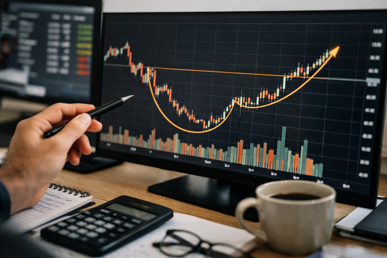 まず、日足と週足で右肩上がりの銘柄を探します。次に、高値圏で丸いカップを作り、直近で小さなハンドルを形成しているかを見ます。そのうえで、ハンドル中に出来高が落ち着いているか、ブレイク時に出来高が増えているかを確認します。ここまで揃って初めて候補です。