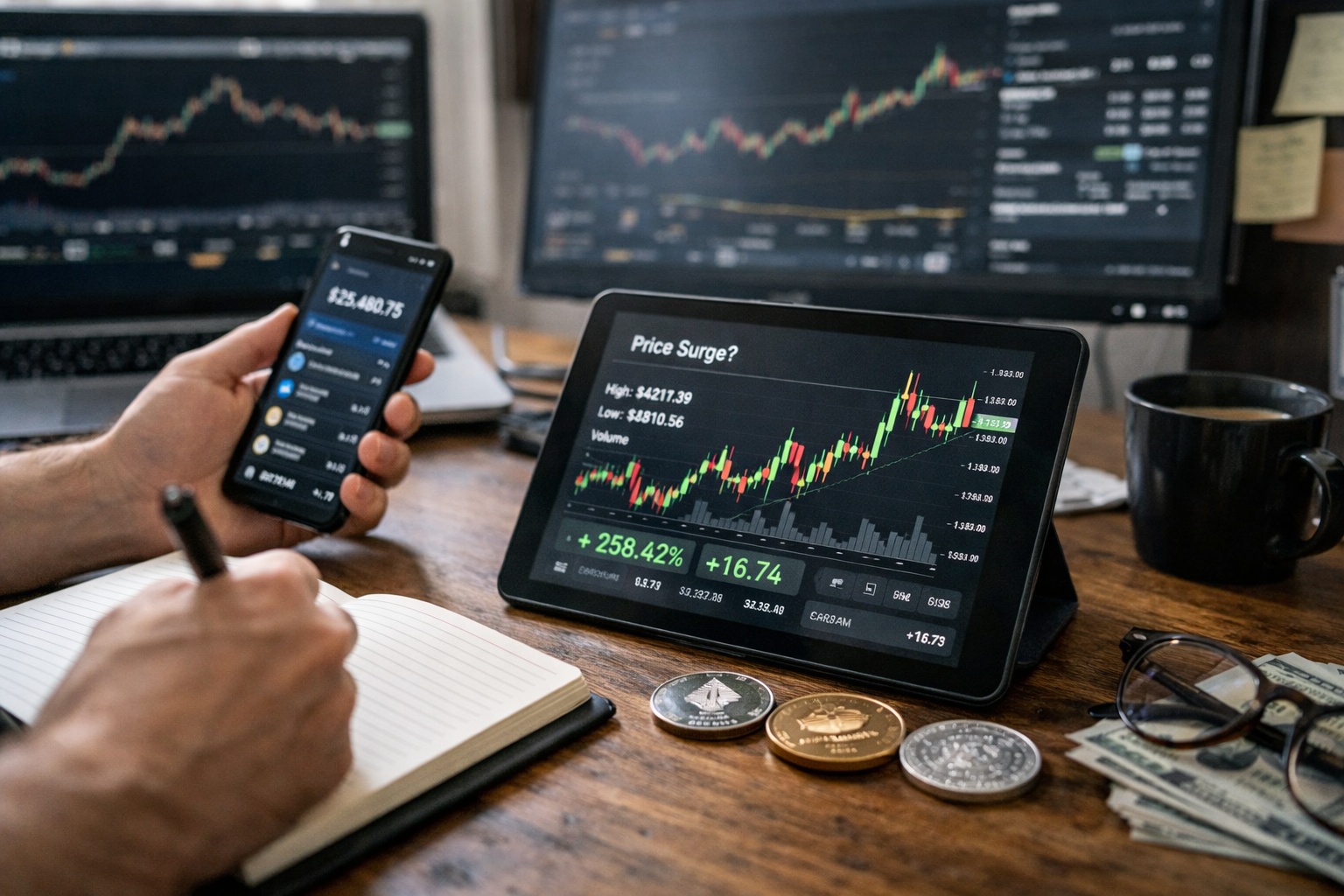 上昇局面では『勝っているものを小さくしない』が基本です。利益が出ているのに不安で早く降りると、最大の波を取り逃します。一方で、ポジションが膨らみすぎると一撃で崩れます。比率上限を先に決め、上限に触れたら一部利確して比率を戻します。