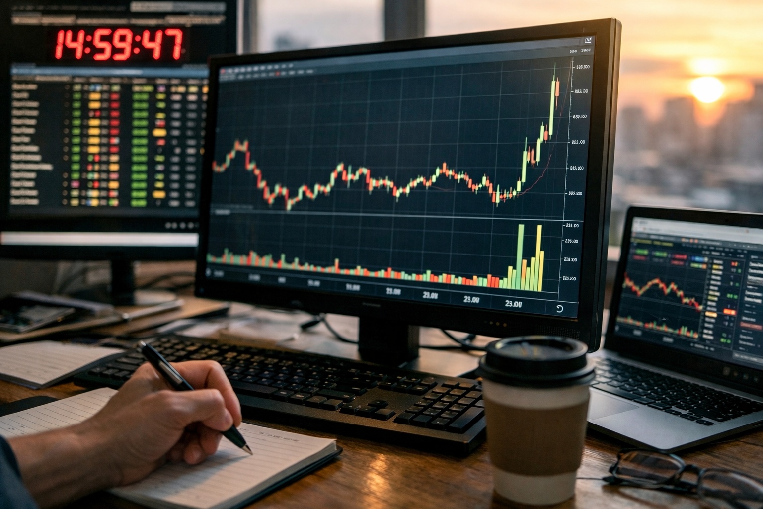 チャートは1分足または5分足、出来高はバーで見ます。最後の5分が膨らみ始めたら、歩み値で同サイズ連続・板の厚みの変化を確認。引け直前の乱高下ではなく、「大きな出来高なのに価格が崩れない」状態が理想です。