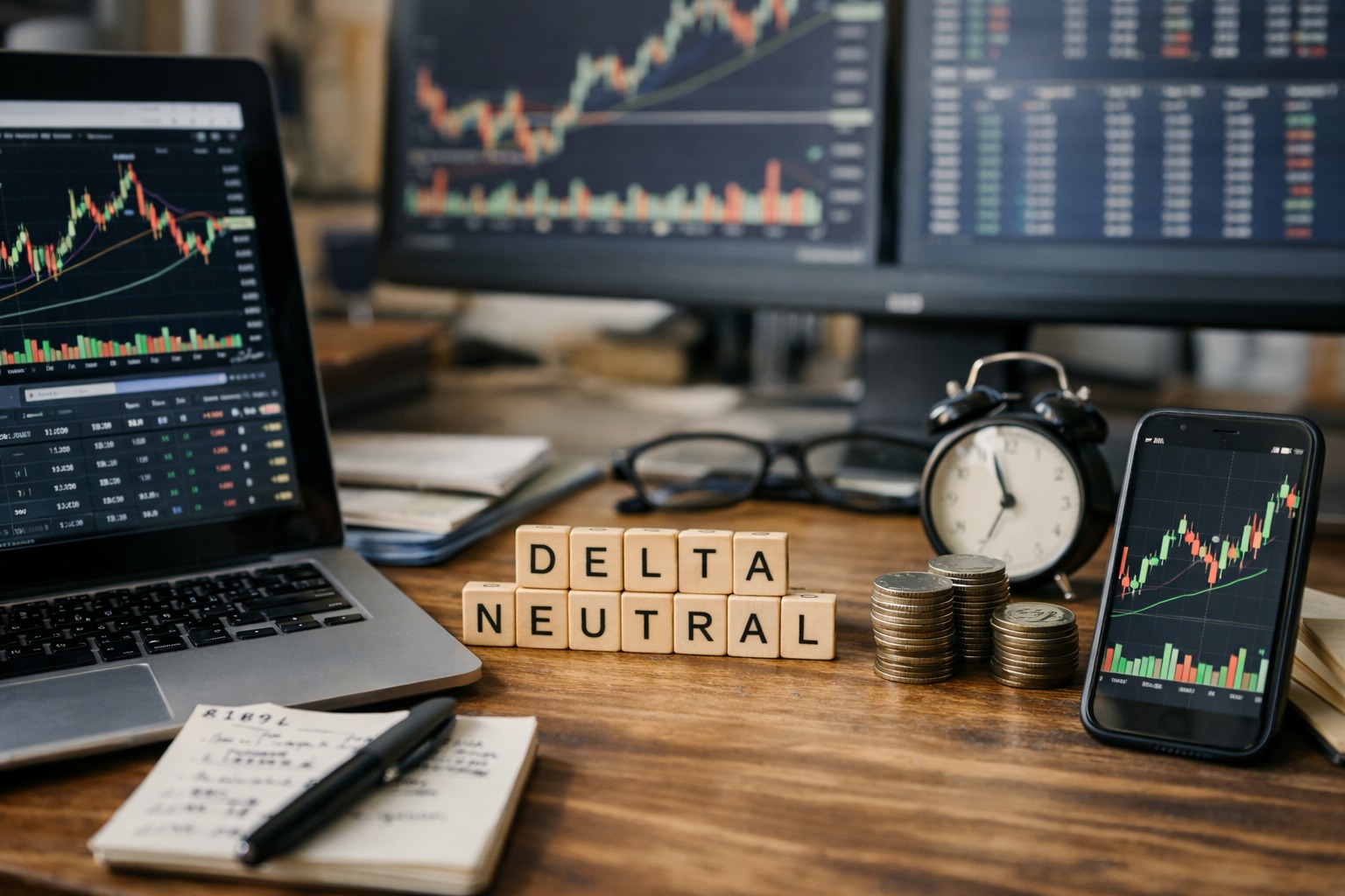 ただし、デルタニュートラルは「ノーリスク」ではありません。むしろ、方向性リスクを減らす代わりに、ガンマ(急変への弱さ)、ベガ(IV変動)、流動性、スリッページ、マージン、ファンディング、イベントギャップなど、別のリスクが前面に出ます。本記事では、初心者でも実務的に理解できるように、用語の整理から、戦略の型、ヘッジのルール設計、失敗パターンまでを、具体例ベースで徹底的に解説します。