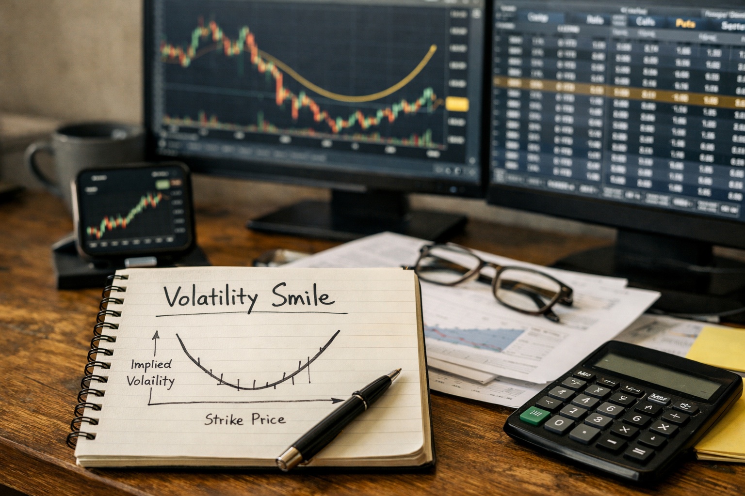 同一の満期(満了日)を持つオプションを、行使価格(ストライク)ごとに並べると、IVが一定ではなく曲線になります。この曲線が「ボラティリティ・スマイル」です。理論上、単純なモデルではIVはストライクに依存しませんが、現実の市場では依存します。ここに“歪み”が生まれます。