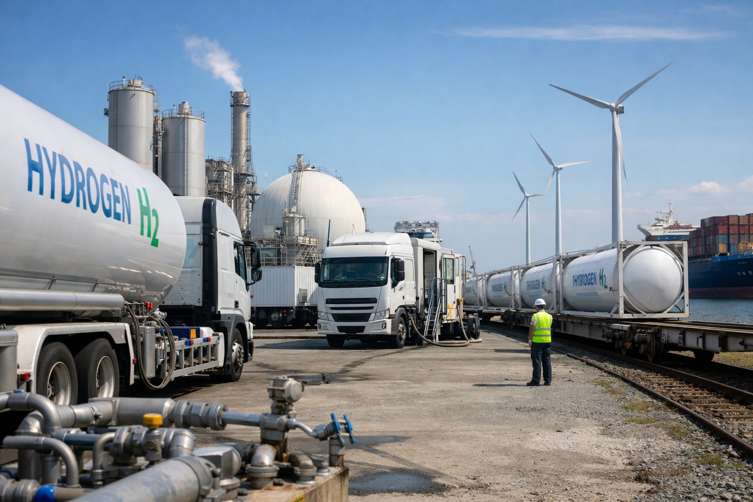 ケース:海外(再エネ豊富な地域)でグリーン水素を製造→アンモニアに変換→専用船で輸送→日本の港で受入→発電所・化学工場へ供給。