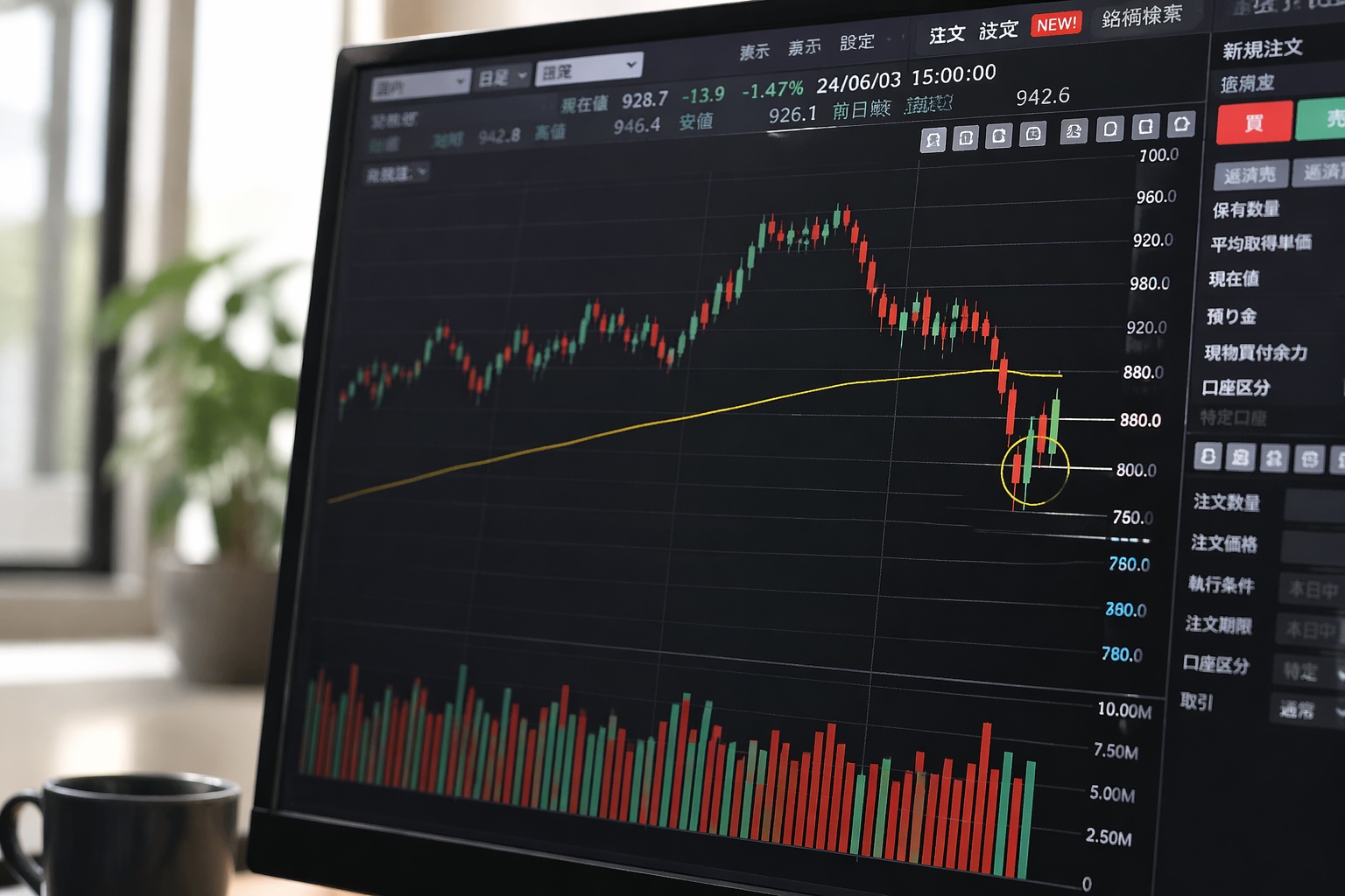 強い銘柄の健全な押し目は、上昇時に出来高が増え、調整時に出来高が減ります。これは売りが殺到していない証拠です。逆に、50日線まで落ちる途中で出来高が膨らみ続ける場合は、機関投資家が本気で逃げている可能性があります。