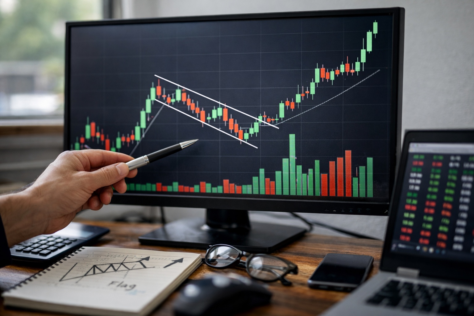 旗部分は、上昇後の小幅な調整です。理想は、価格が急落せず、5日から15日程度の範囲で緩やかに下げるか横ばいを続ける形です。この局面で出来高が徐々に減少していれば、売りたい人はそこまで多くなく、短期の利食いだけが進んでいる可能性が高まります。逆に、調整中なのに出来高が膨らんで下げ幅も大きい場合は、機関や大口の売りが混じっている可能性があり、フラッグではなく分配局面を疑うべきです。