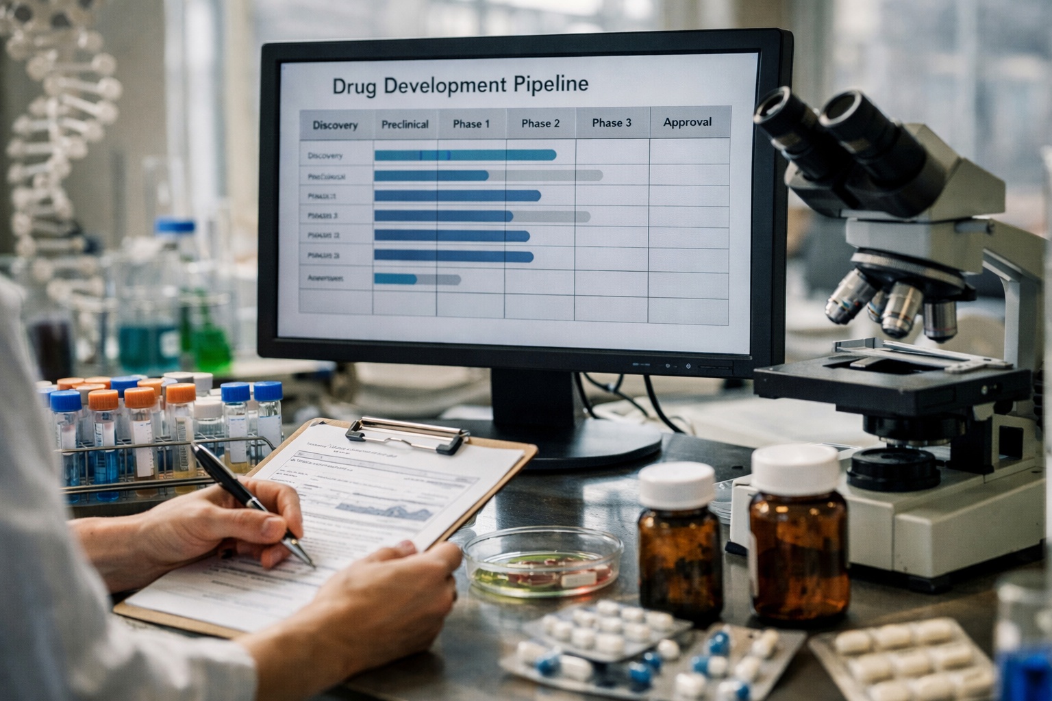 新薬パイプラインとは、企業が開発している薬候補の一覧です。まだ研究段階のものもあれば、臨床試験の最終段階にあるものもあります。投資家にとって重要なのは、パイプラインの「本数」より「質」と「進み具合」です。十本の候補薬を持っていても、全部が初期研究なら企業価値は不安定です。逆に二本しかなくても、そのうち一本が承認直前で対象市場が大きければ非常に大きな価値を持ちます。