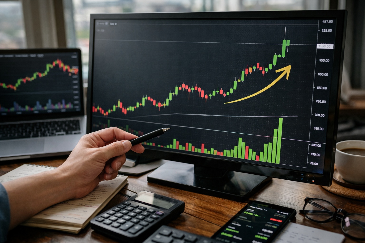 仮にA社の株価が1,200円前後で2か月近く上値を抑えられていたとします。直近20日平均出来高は30万株です。ある日、決算で営業利益の上方修正を発表し、株価は1,240円の抵抗帯を終値1,278円で明確に突破、出来高は110万株でした。平均の約3.7倍です。売買代金も十分にあり、引けは高値近辺でした。