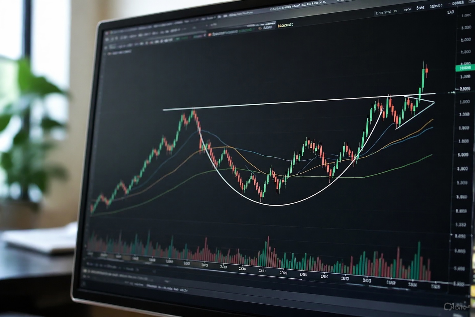 ハンドル部分は、元の高値圏で数日から数週間程度の小反落が入る場面です。ここで大きく崩れるようなら強いパターンではありません。値幅の目安としては、ハンドルの下落が高値から5%〜10%程度に収まると扱いやすいです。ハンドル形成中に出来高が減るのも重要です。売り物が薄くなっている証拠だからです。