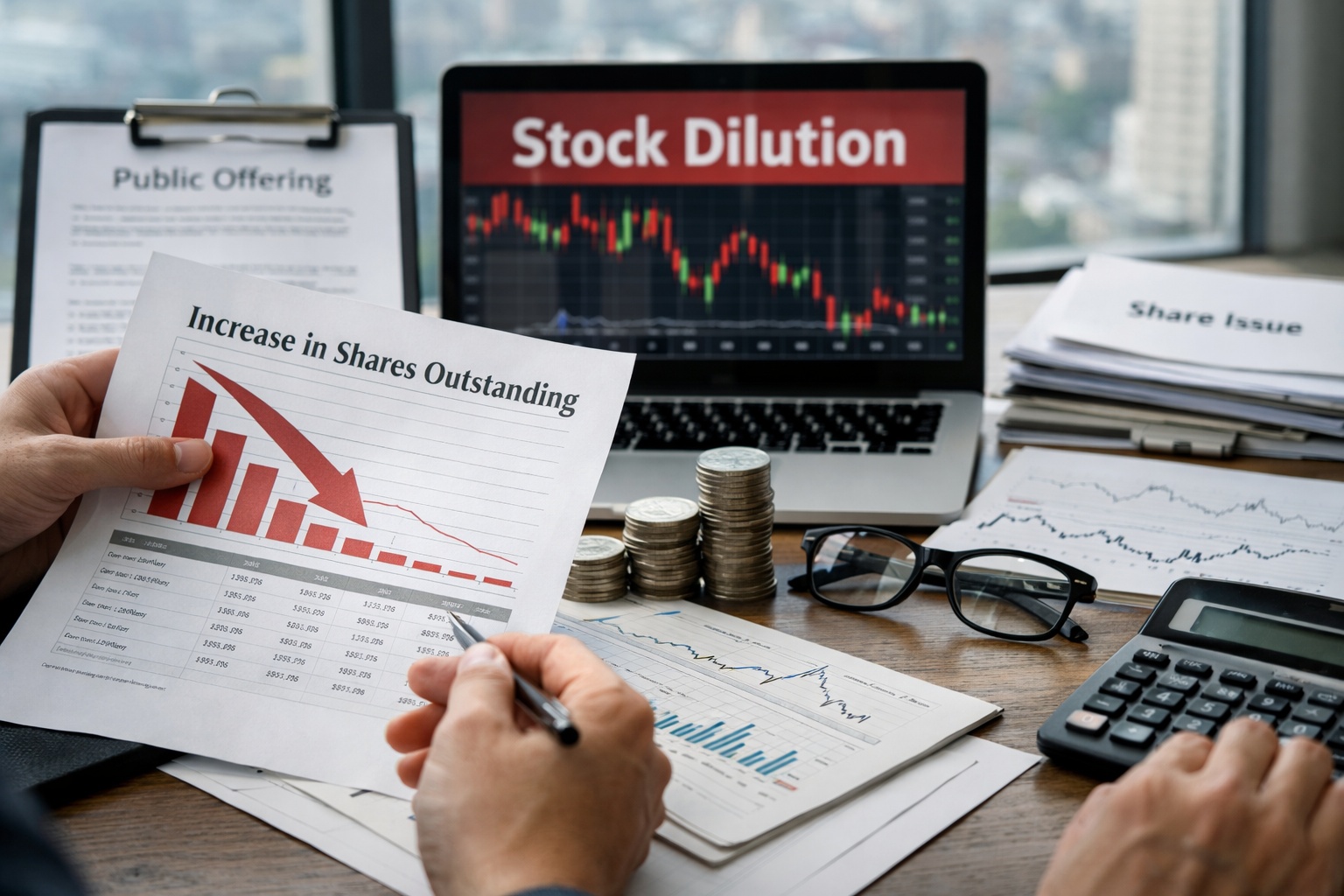 投資家が最も警戒するのが公募増資です。新株(または売出)を広く投資家に配り、短期間で大量の供給が出ます。ディスカウント率(市場価格より何%安いか)と発行規模が大きいほど、短期の下押し圧力が増えます。