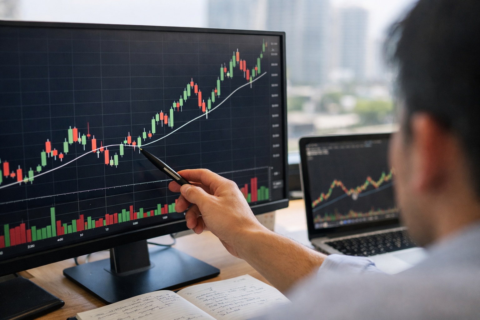 次に、損切り幅(値幅)を決める。例えばエントリー価格から-1.5%で切るなら、許容損失5,000円 ÷ 1.5% = 約333,333円分の建玉が上限です。株なら購入額、FXなら必要証拠金ではなく建玉の想定損益で計算します。