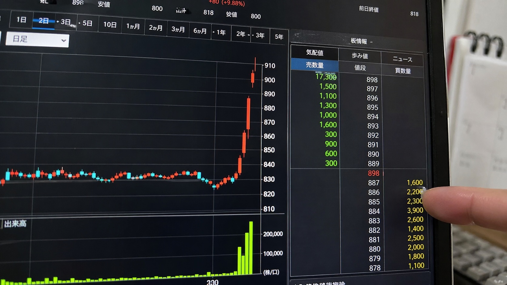 IPO銘柄では、チャート上は魅力的でも、実際に売買しようとすると板が薄いケースがあります。板が薄い銘柄では、成行注文を出した瞬間に想定より高い価格で約定したり、損切り注文が想定より低い価格で約定したりします。これをスリッページと呼びます。出来高が増えている銘柄でも、板の厚みが一時的なものにすぎない場合があるため注意が必要です。