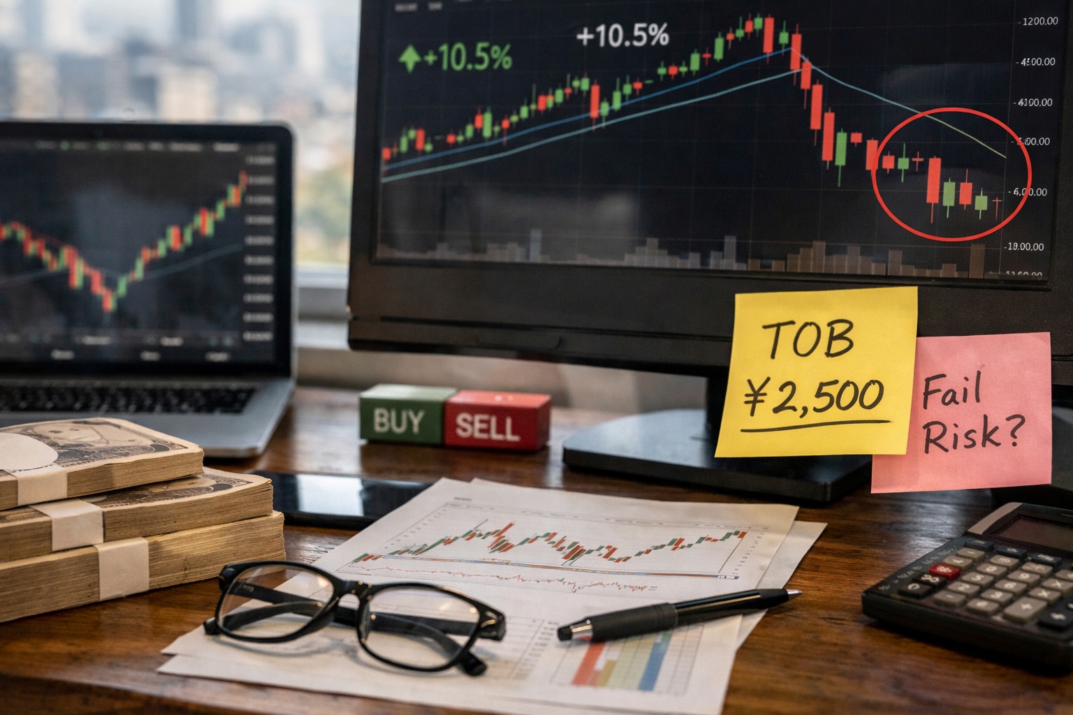 失敗2:部分TOBの按分を甘く見る:応募しても全部買ってもらえず、残株がTOB終了後に下げることがあります。初心者は部分TOBを原則回避すると事故率が下がります。