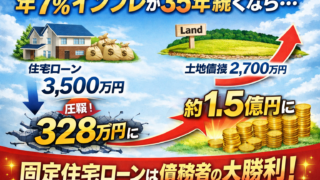 年7%インフレが35年続く仮定で、3,500万円の35年固定ローンの実質負担がどう圧縮されるかを数式で解説。土地2,700万円が年5%上昇する場合の名目・実質評価も整理します。