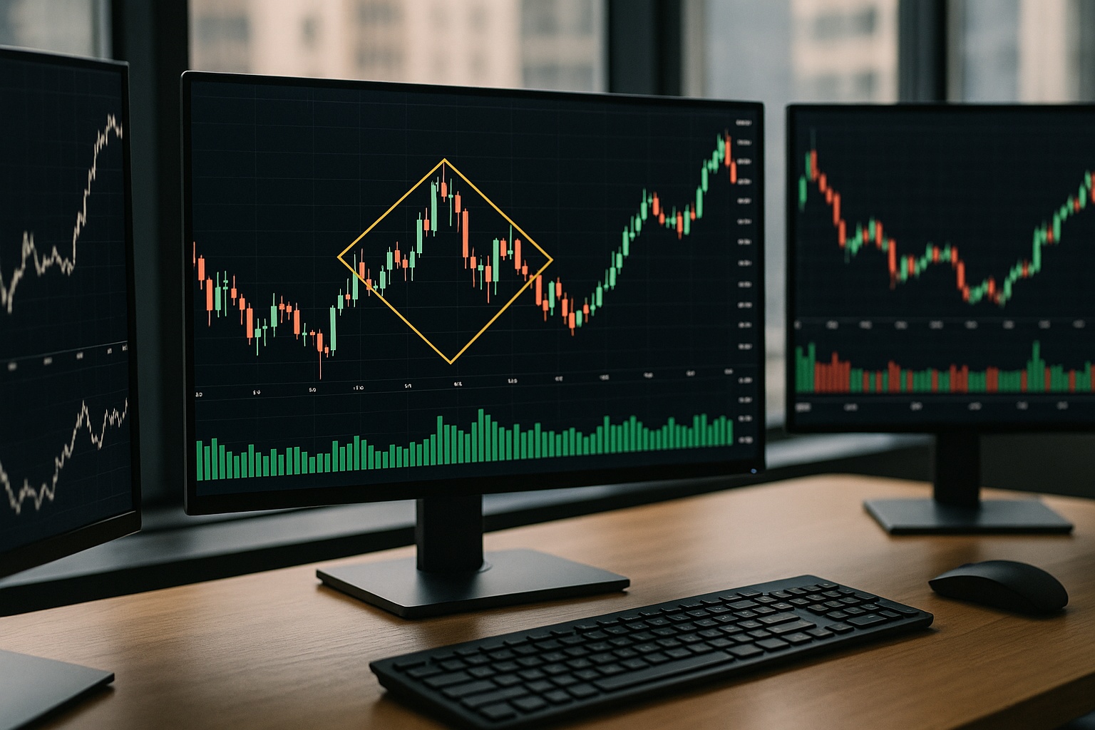 ここで左側に拡大型の動きが現れ、その後、市場が情報を消化するにつれて値幅が縮小していきます。チャート上で高値と安値を結ぶと、ダイヤモンドのような形が浮かび上がることがあります。右肩のサポートラインを明確に割り込んだら、売り圧力が勝ったと判断してショート(または保有株の売却)を検討する、という使い方ができます。