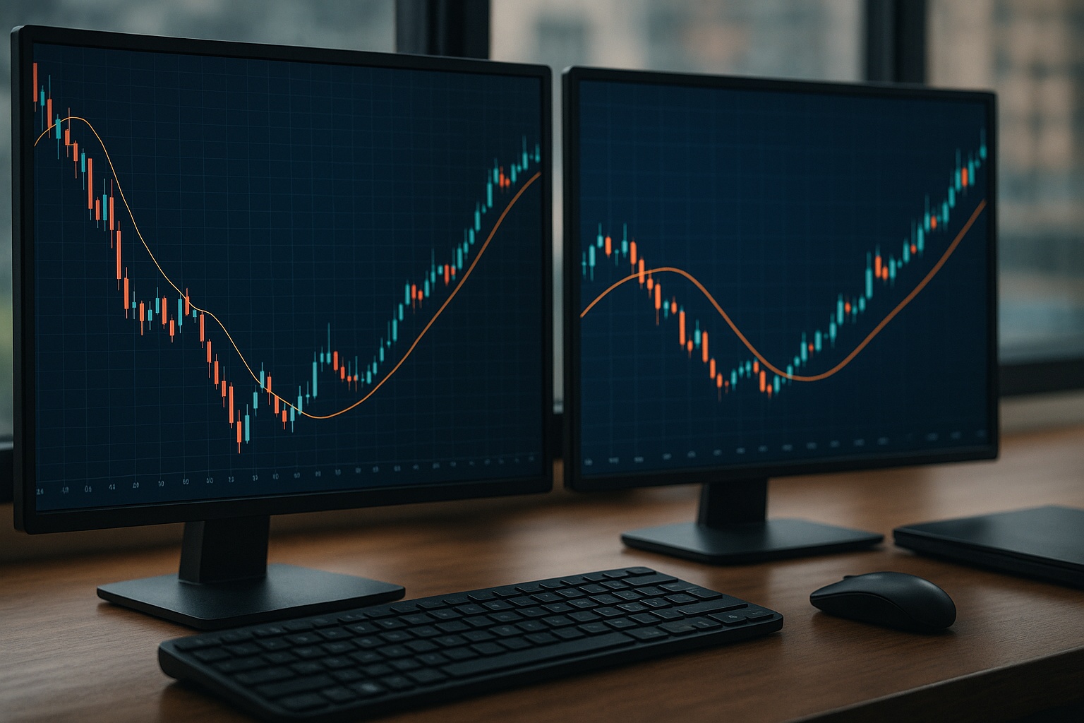 ここからは、FXのドル円や、暗号資産のビットコイン/USDTなどを想定した、カルマンフィルター活用のシナリオをいくつか紹介します。実際のチャートプラットフォーム上では、「カルマン平均」のような名前のカスタムインジケーターとして実装されることを想定してください。